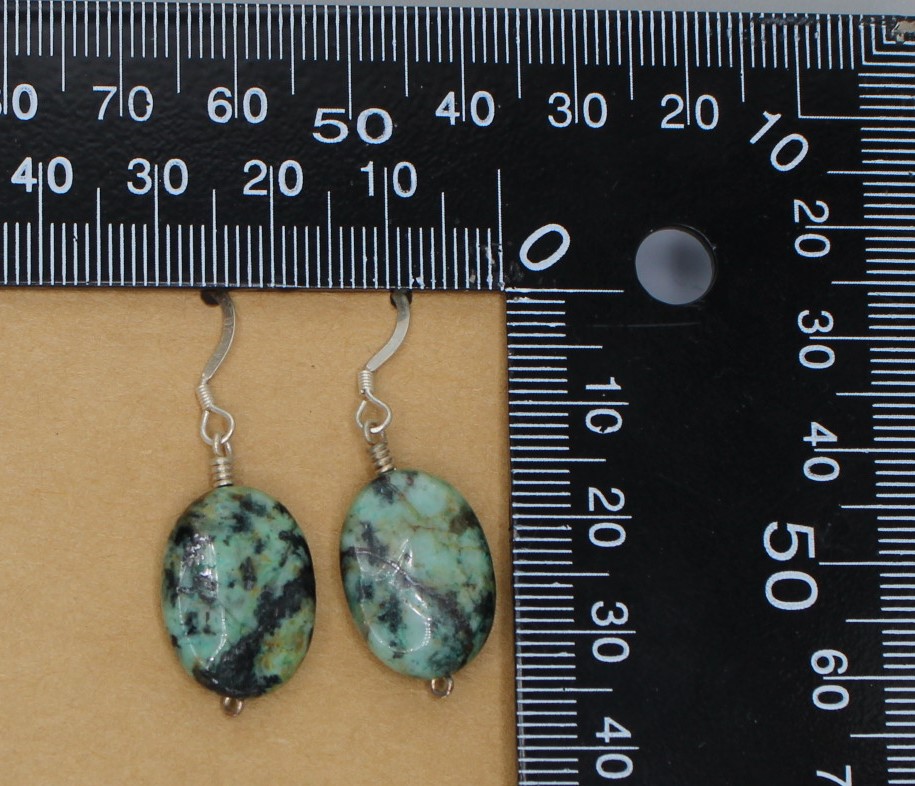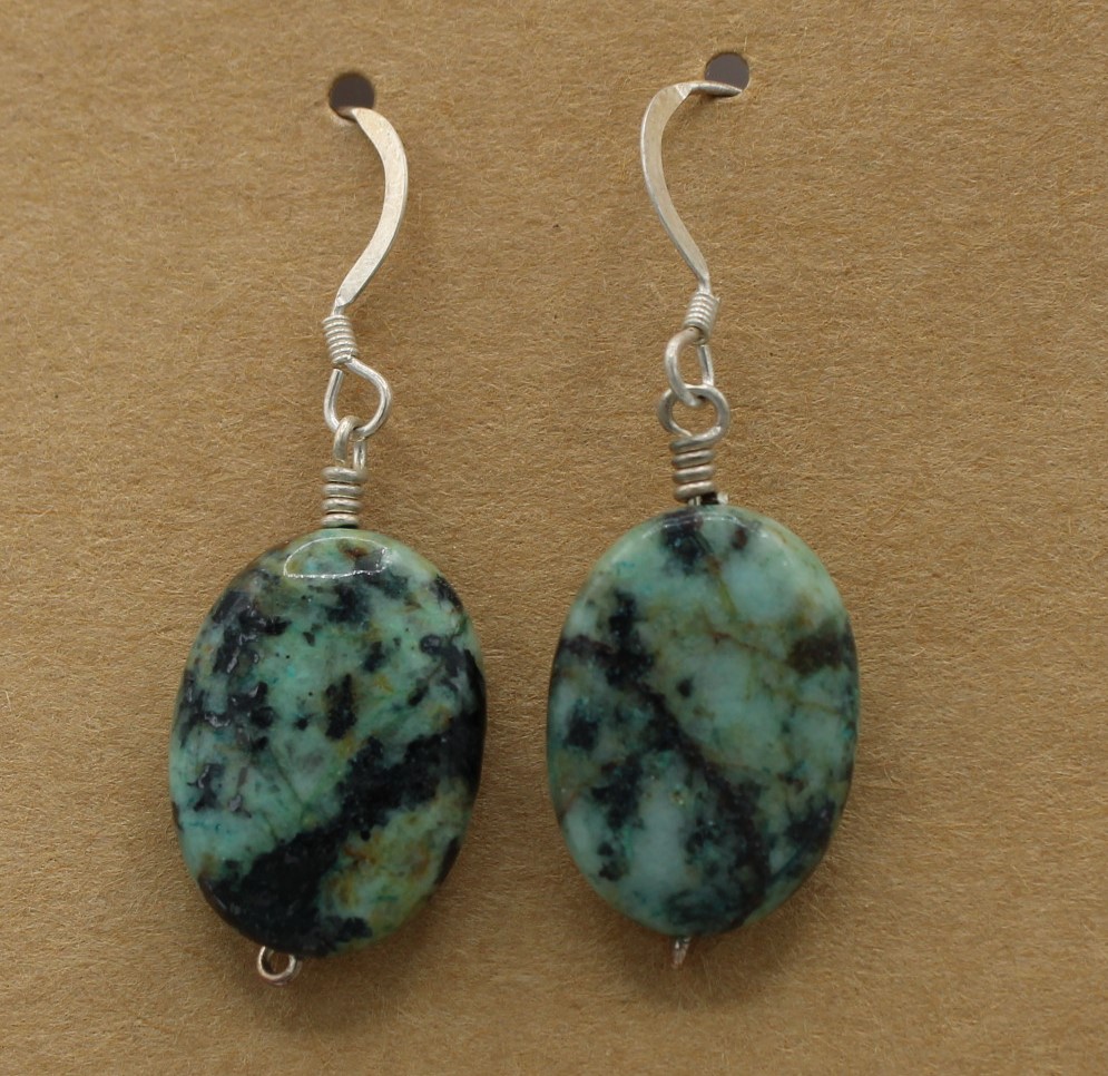 Turquoise (African) Oval bead hangs from simple hand-wrapped Sterling Silver (.925) clasp, with Sterling Silver hook and clear plastic backing.