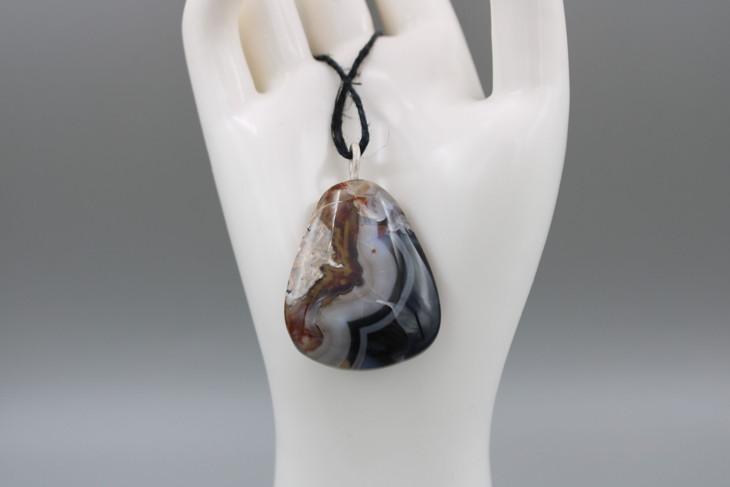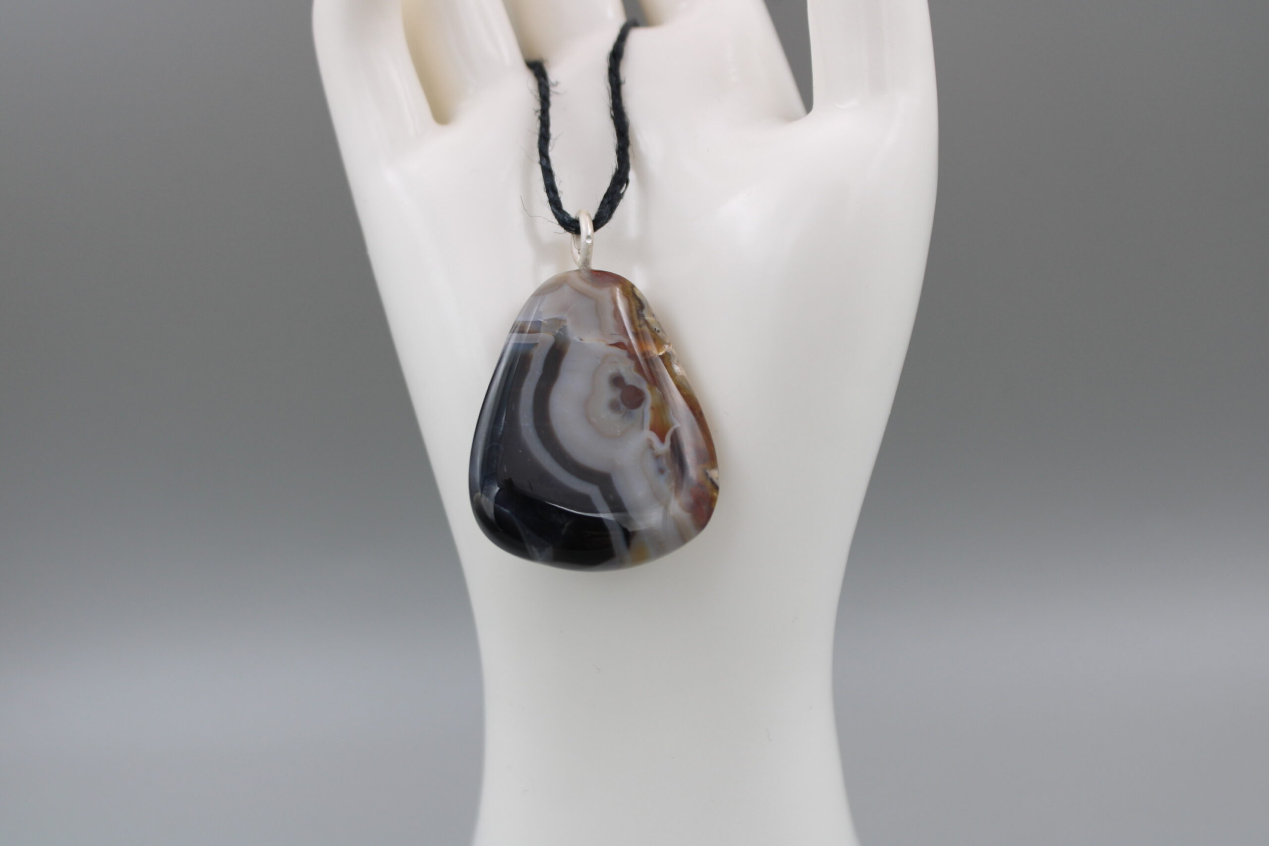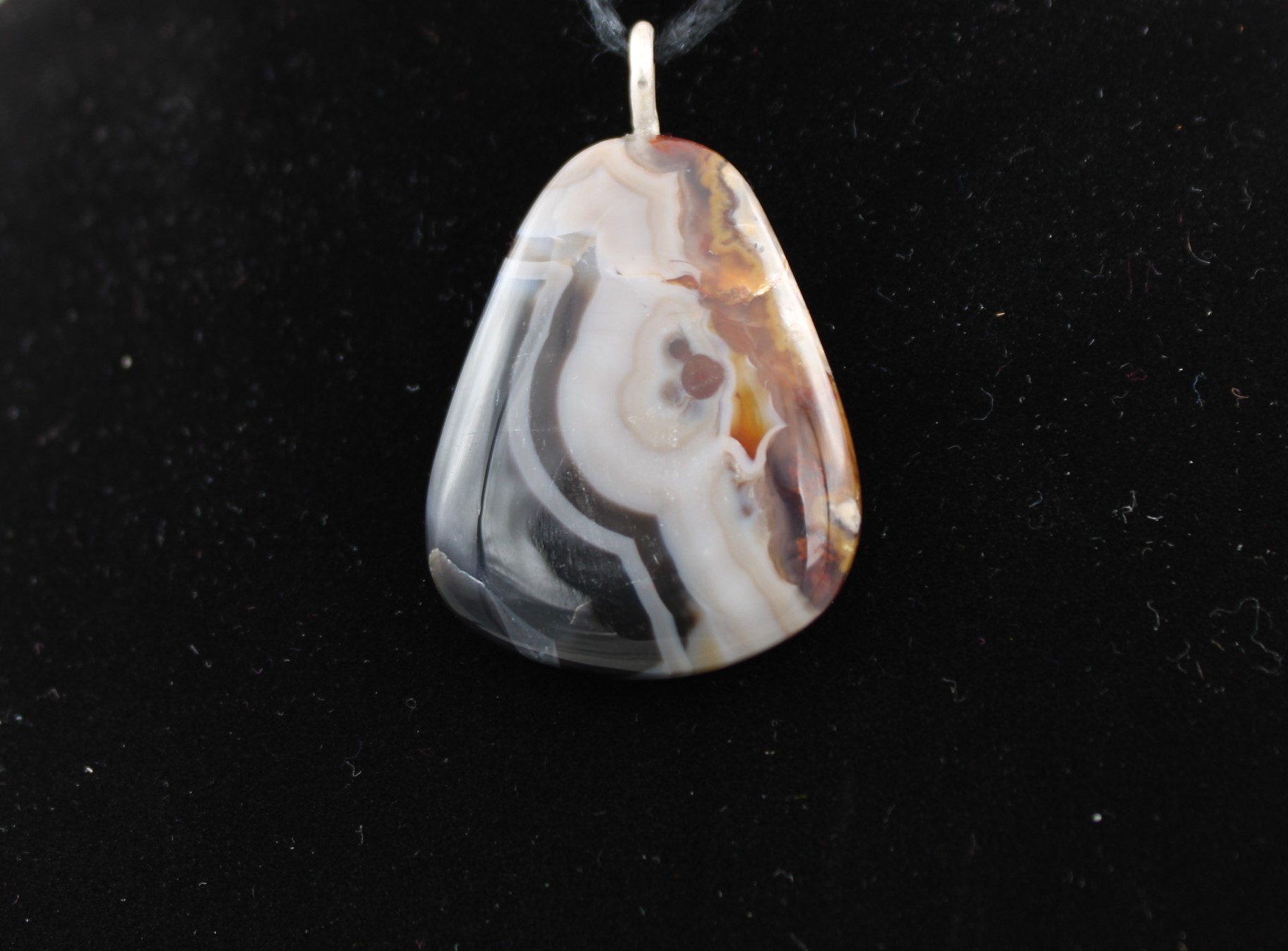 This translucent agate has banded colors and patterns that are the result of pseudomorrphic replacement and also has a section of dense rod-like formations. This occurs when agate fills a cavity within a rock that already contains mineral formations throughout. In the case of these stick agates from Turkey, the agate formed as a pseudomorph after aragonite and/or sagenite crystals. In some cases, these aragonite crystals form as hollow tubes that, when polished, contain agate and/or druzy quartz within.