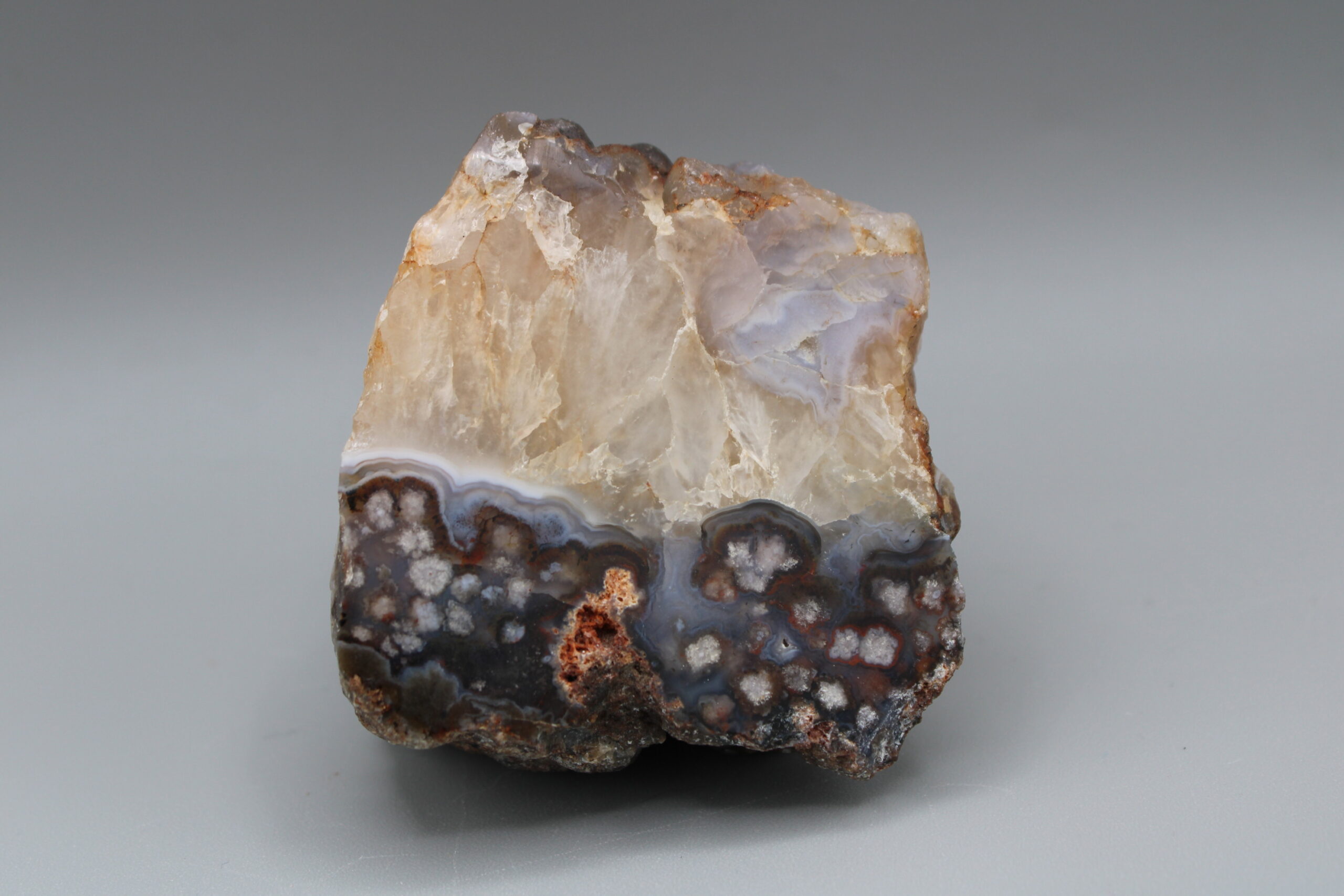 This translucent agate has banded colors and patterns that are the result of pseudomorrphic replacement and also has a section of dense rod-like formations. This occurs when agate fills a cavity within a rock that already contains mineral formations throughout. In the case of these stick agates from Turkey, the agate formed as a pseudomorph after aragonite and/or sagenite crystals. In some cases, these aragonite crystals form as hollow tubes that, when polished, contain agate and/or druzy quartz within.
