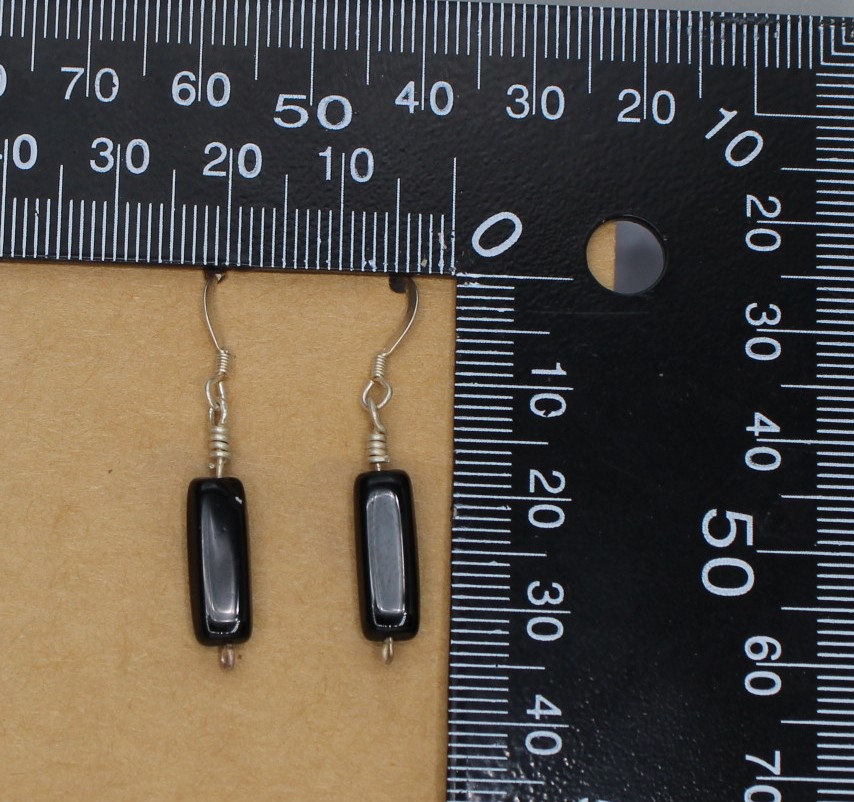 Black Onyx rectangular block bead hangs from simple hand-wrapped Sterling Silver (.925) clasp, with Sterling Silver hook and clear plastic backing.