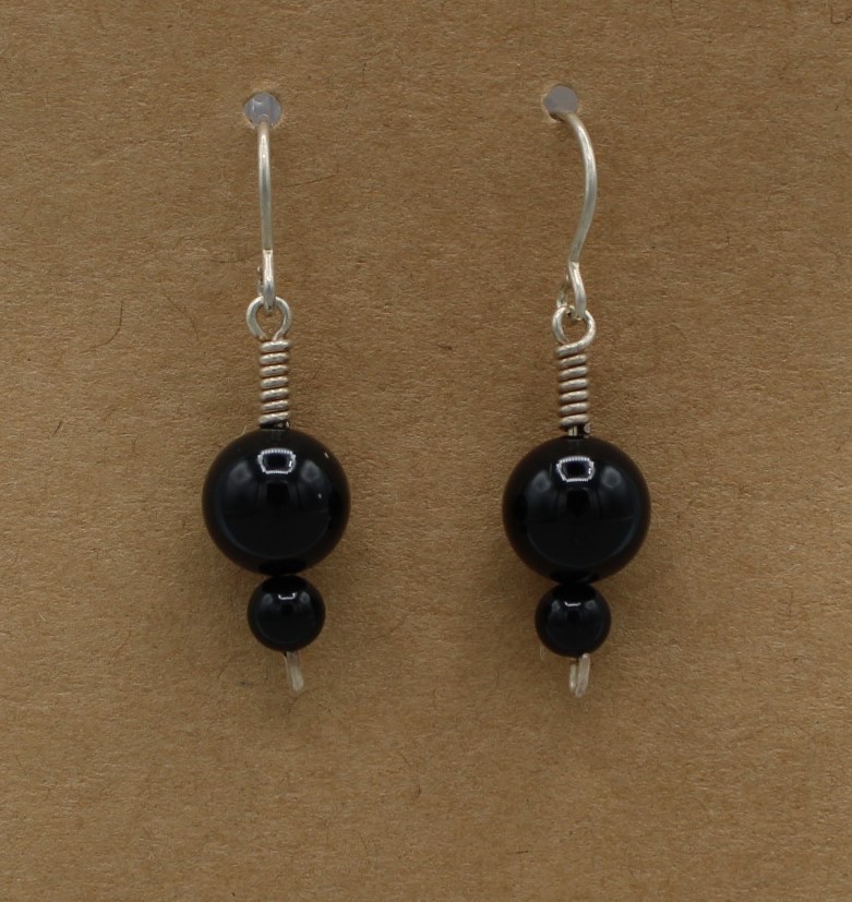Black Onyx beads hang from simple hand-wrapped Sterling Silver (.925) clasp, with Sterling Silver hook and clear plastic backing.