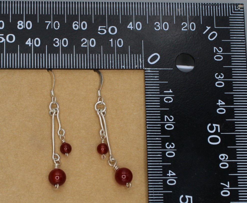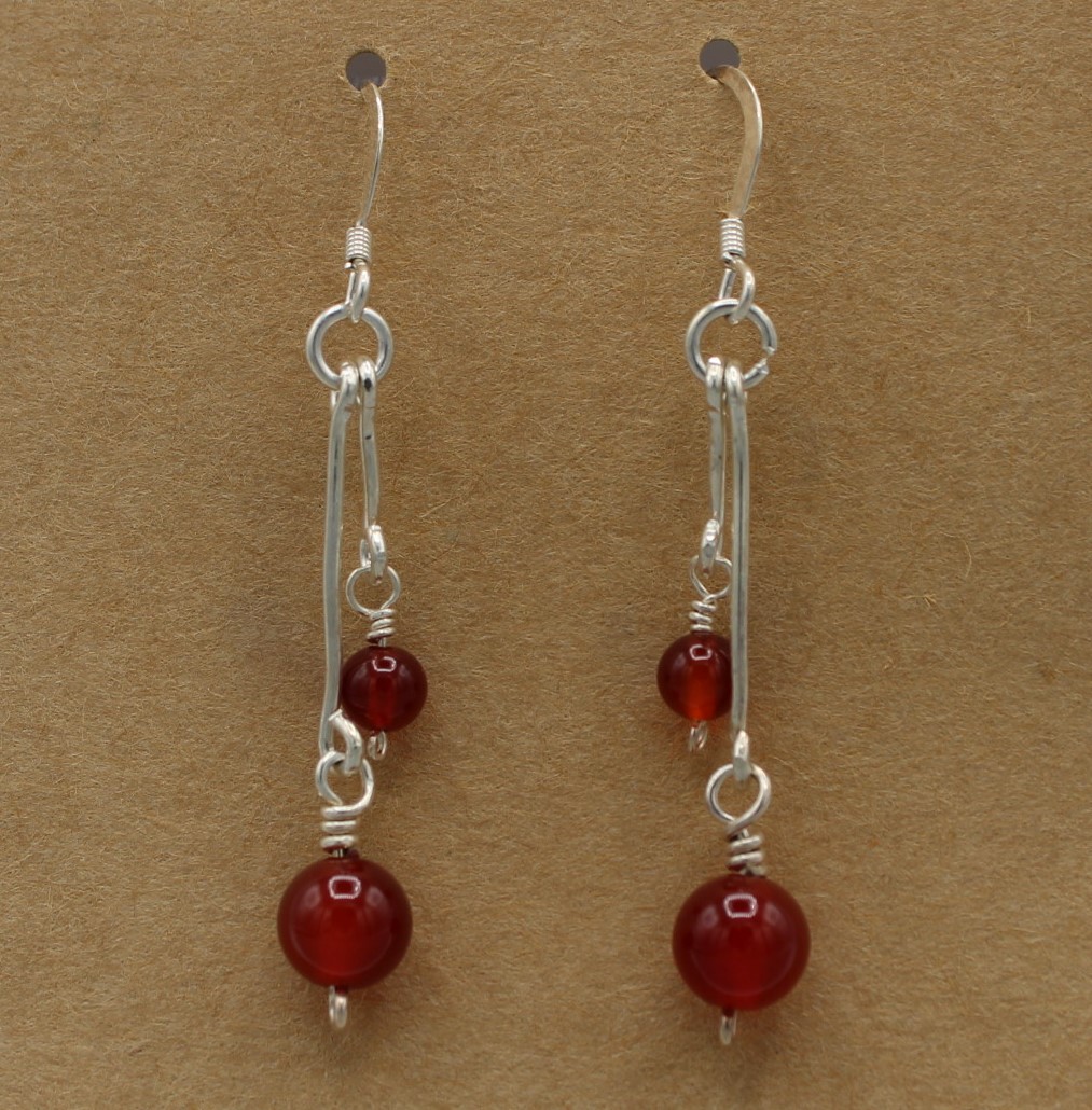 Carnelian beads drop from hand-wrapped Sterling Silver (.925)Â clasp, with Sterling Silver hook and clear plastic backing.
