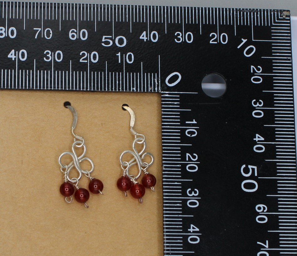 Carnelian beads hang from clover-shaped hand-wrapped Sterling Silver (.925) clasp, with Sterling Silver hook and clear plastic backing.
