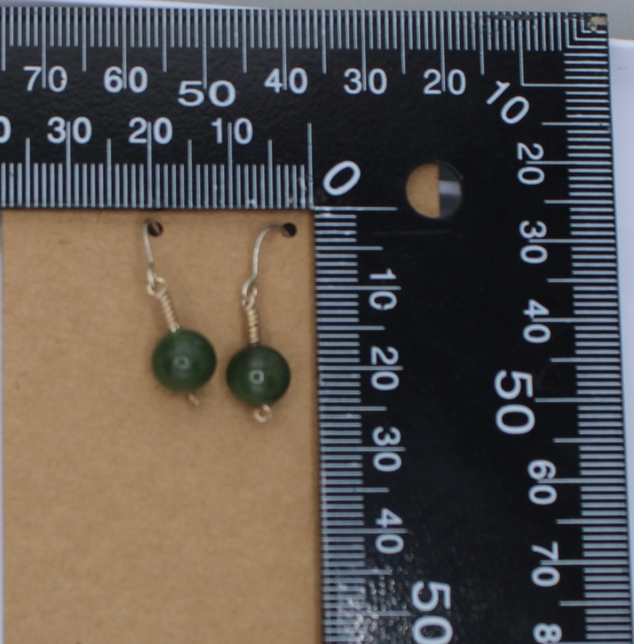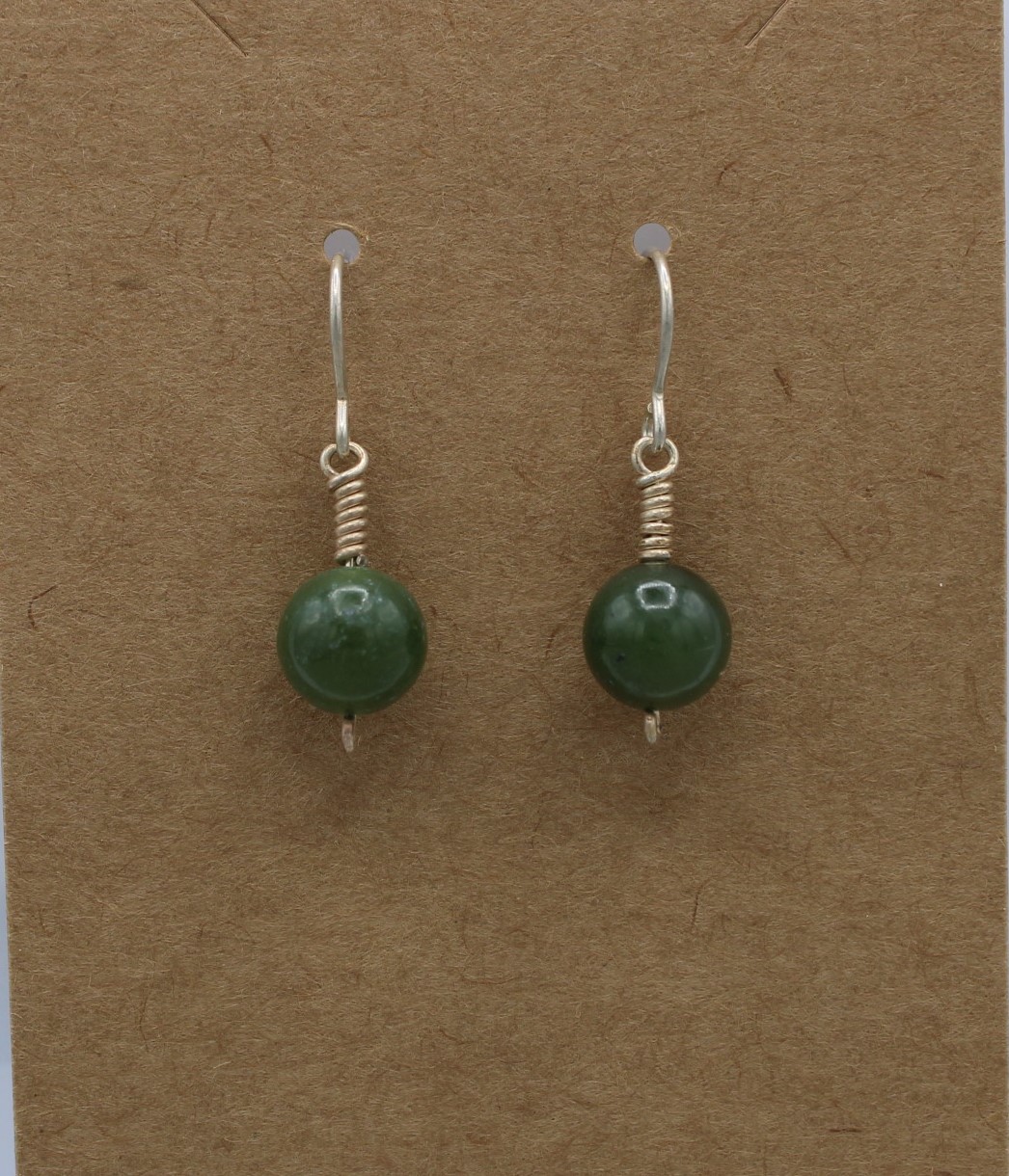 Jade bead hangs from simple hand-wrapped Sterling Silver (.925) clasp, with Sterling Silver hook and clear plastic backing.