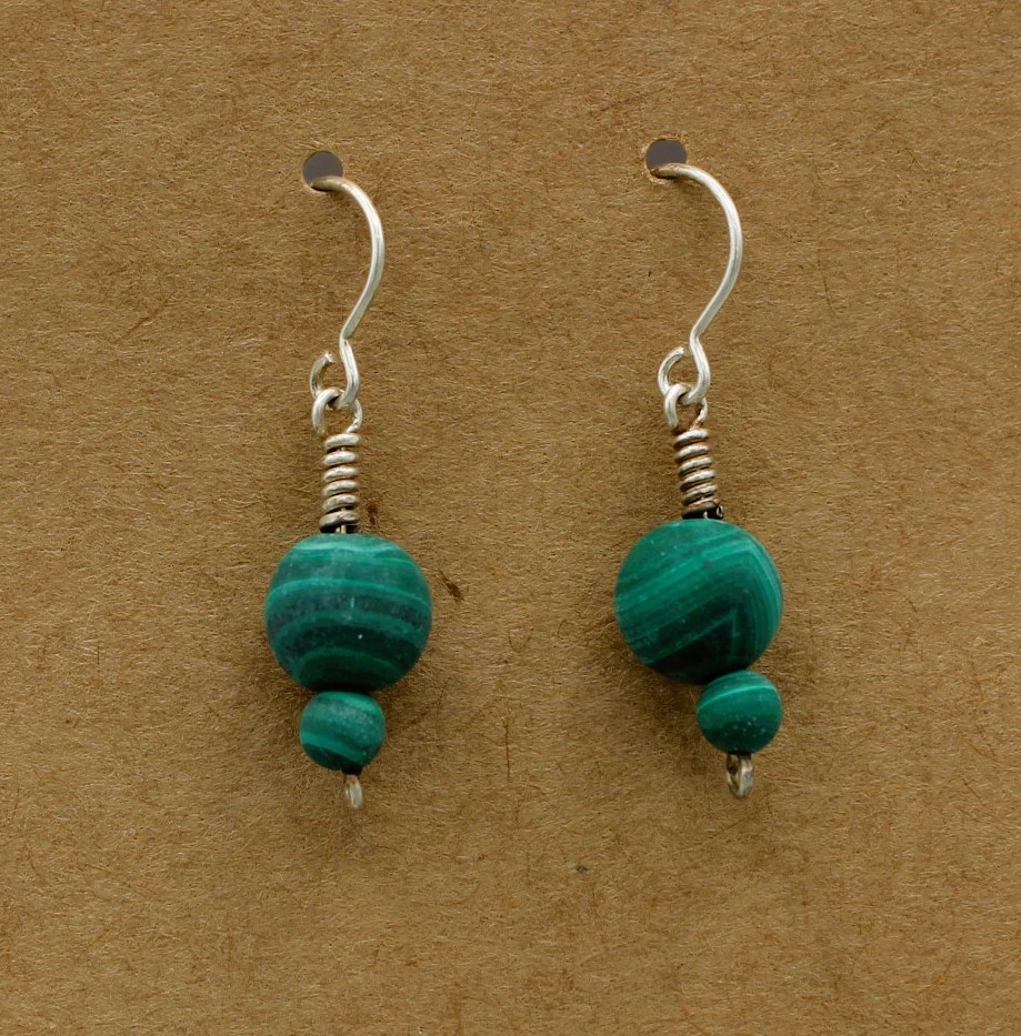 Malachite beads hang from simple hand-wrapped Sterling Silver (.925) clasp, with Sterling Silver hook and clear plastic backing.