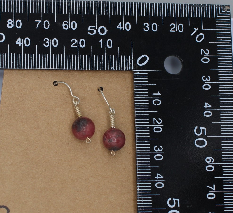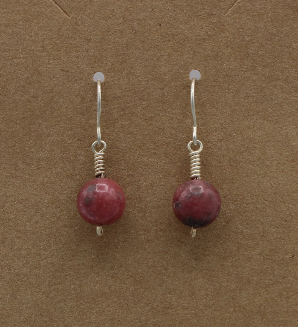 Rhodonite beads hang from simple hand-wrapped Sterling Silver (.925) clasp, with Sterling Silver hook and clear plastic backing.